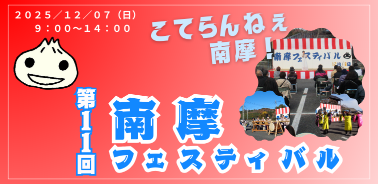 2025年12月7日(日)9:00~14:00、鹿沼市南摩コミュニティセンターで第11回南摩フェスティバルを開催!プリティワールドや南摩中学生のステージパフォーマンス、伝統のお囃子演奏、なんまん焼き・自治会そば・一本杉農園など地元グルメ17店舗が出店。お米重さ当てなど楽しい企画も。南摩・粟野エリアの魅力を存分に体感できる地域密着型フェスティバルです。入場無料、駐車場あり。